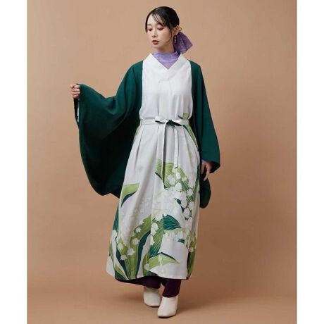 鈴蘭をあしらった羽織とワンピースのセット商品。これ一組で和装の着こなしが完成する入門にもぴったりな商品です。羽織だけでも、ワンピースだけでも、組み合わせても楽しめる三通りの着こなしが可能。ロングシーズン着回しができる商品です。