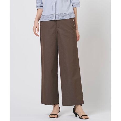 ■デザインややワイドなストレートシルエットのパンツ。さりげなく利かせたマリンディテールが春夏らしい軽やかな表情をプラスしています。後ウエストはゴム仕様で、伸縮性があり、程よくフィットしながらも快適な穿き心地に。フロントポケットにはパイピングテープを挟み込み、シンプルな中にも品のあるアクセントをプラスしました。合わせるトップスやアウターを選ばず、オフィスシーンから休日のカジュアルスタイルまで幅広く活躍してくれるアイテムです。カラーは、清涼感があり軽やかなナチュラル(#002)、上品で柔らかい印象のキャメル(#034)、大人っぽく落ち着いた印象のダークブラウンシャンブレー(#035)、合わせやすい万能カラーのネイビーシャンブレー(#075)の4色展開です。