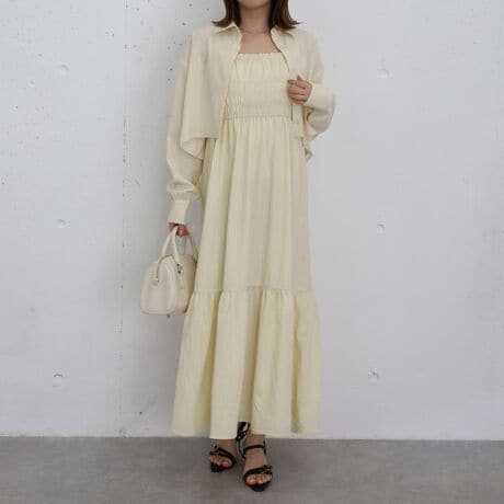 ・落ち感のあるシャーリングキャミワンピとストライプ柄で縦ラインがすっきり着られるデザイン