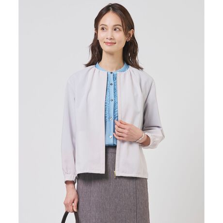■デザイン薄く軽やかな素材を生かした、女性らしいギャザーデザインがポイントのノーカラーブルゾン。フロントジップに沿って施された別布使いがカジュアルになりすぎずきれいめな印象を与えます。裾のドローストリングを絞ることで、丸みのある柔らかなシルエットにアレンジが可能。袖口の内側にはゴムが入っており、9分袖をさっとたくし上げて抜け感のある着こなしも楽しめます。パンツにもスカートにも合わせやすい丈感も魅力。飽きのこないシンプルなデザインは、オンオフ着回しができ、季節の変わり目に重宝します。裏地なしです。