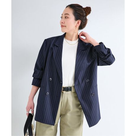 程よく落ち感と艶感がある綺麗目な素材を使用。ややリラックス感のあるメンズライクなボックスシルエットになっています。袖裏は袖を折り返した時にポイントになる配色ストライプ、ダブル前仕立てで開きはボリューム感が出て動きが出ます。無地とストライプの展開になり、ストライプはリラックスパンツとセット着用可能。