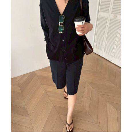 膝にかかる丈感と、センタープレスで大人カジュアルに仕上げたハーフパンツ。