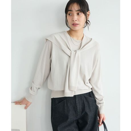 程よくコンパクトなボディはインでもアウトでもバランスが取りやすく、首元に巻いたストールは肩掛けや斜め掛け、腰巻きと用途が広いデザイン。
