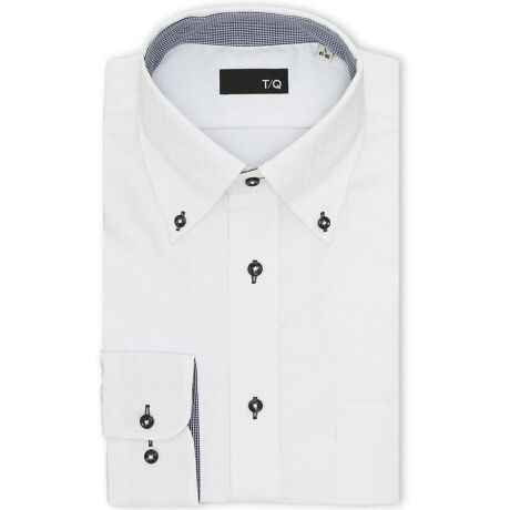 表面感のあるドビーの織り柄(市松模様)です。衿型はアンタイド(ノーネクタイ)でも衿立ちよく収まり、オフィスカジュアルにもぴったりなボタンダウンを採用しています。台衿・カフス裏の別生地がアクセントになっています。