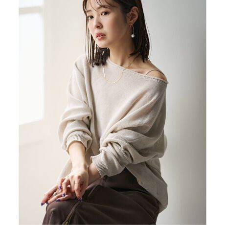 広めに開いた襟ぐりはカジュアルになりすぎず、さり気なく女性らしさを惹き立てます。