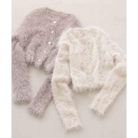 キラキラとした毛足のあるニットカーディガン。ざっくりとしたシルエットが愛らしく、一枚で華やかな印象を与えてくれます。柔らかな風合いが心地よく、前ボタンを留めるとプルオーバーとしても活躍。デイリーからお出かけシーンまで着回せます。