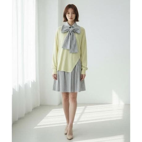 【トレンドのレイヤードスタイルが叶うニット×シャツワンピースセット】【Point】・ボウタイシャツワンピースとニットがセットになったレイヤードアイテム。・ワンピースのリボンは大胆にボリュームをだすことで顔まわりを華やかに魅せます。・裾はプリーツデザインで可憐で上品な印象を引き立てます。・ニットはシンプルなデザインの中にスリットを入れ、抜け感を演出。・ワンピースとニットはそれぞれ単品使いも可能なので、着こなしの幅を広げてくれます。ケア方法:ドライクリーニング透け感:なし裏地:なし伸縮性:なし光沢感:なし生地の厚さ:薄手