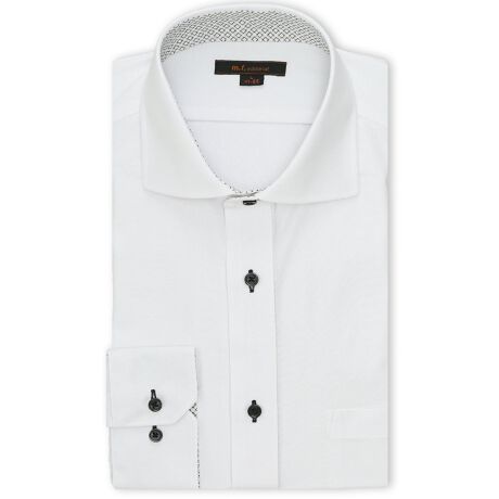 表面感のあるドビーの織り柄(ヘリンボン)です。衿型はノータイでのオフィスカジュアルに最適なカッタウェイを採用。剣先が外に大きく開いていて、衿が目立たずスッキリとした印象です。台衿・カフス裏の別生地と角落ち型のカフスがアクセントになっています。