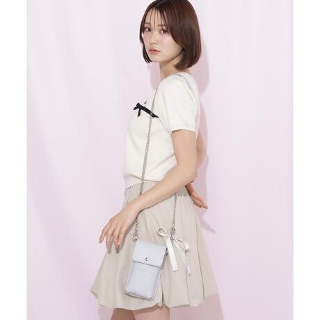 ブランドロゴ入りのリボンチャームがさりげないアクセントになった、コンパクトなマルチポシェット。フラップ付きで中身をしっかりカバーできるため、見た目の可愛らしさと使いやすさを兼ね備えたデザインです。ハンカチやリップなどの小物がすっきり収まる程よいサイズ感で、身軽にお出かけしたい日にぴったり。コーディネートのアクセントとしても活躍し、夏のイベントやお出かけシーンを可愛く彩ってくれるおすすめのアイテムです。※撮影時照明の関係により、色味が違って見える場合がございます。またパソコン・スマートフォンなどの環境により、若干製品と画像のカラーが異なる場合もございます。予めご了承ください。商品の色味は、商品単品画像をご参照下さい。※商品画像はサンプルのため、色味やサイズ等の仕様に変更がある場合がございますので、予めご了承ください。
