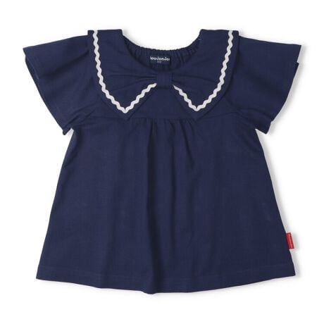 リボンのデザインの衿が可愛い!テープ使いもポイント!シンプルでも女の子らしい半袖Tシャツ。セーラー風デザインが夏らしい!後ろの衿ぐり部分がゴム仕様になっているので、着脱もスムーズに出来ます。夏のお出かけにオススメな1枚。【アイテム】トップス シンプル ガーリー フェミニン カジュアル お洒落 オシャレ かわいい 可愛い 普段着 デイリーウェア お出かけ着 お外着 お外遊び着 子ども こども 女児 女の子 ガールズ キッズ ベビーサイズ トドラーサイズ 幼稚園 保育園 小学校 通園 通学 小学生 2026年春夏物新作 丸高衣料 ホワイト 白色 ネイビー 紺色 ムージョンジョン コットン100% 綿100%
