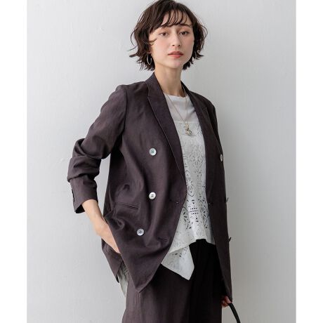 長めの着丈とシャープな印象のピークドラペル(剣襟)が特徴的なダブルフロントジャケットです。 ボクシーになりすぎないすっきりとしたシルエットで、オフィスでのきれいめスタイルはもちろん、Tシャツやデニムと合わせた大人のカジュアルスタイルにもマッチします。袖口は本格的な本あき仕様で細部までこだわりました。 フロントボタンを開けてラフに着こなしたり、肩にさらっと掛けてリラックス感のあるこなれ感を演出するのもおすすめ。同素材のパンツと合わせれば、洗練されたセットアップスタイルが完成します。 カラーは、肌なじみが良く上品なベージュ(#033)、知的で引き締まった印象のネイビー(#075)、深みのあるトーンでシックなダークブラウン(#035)の3色展開です。