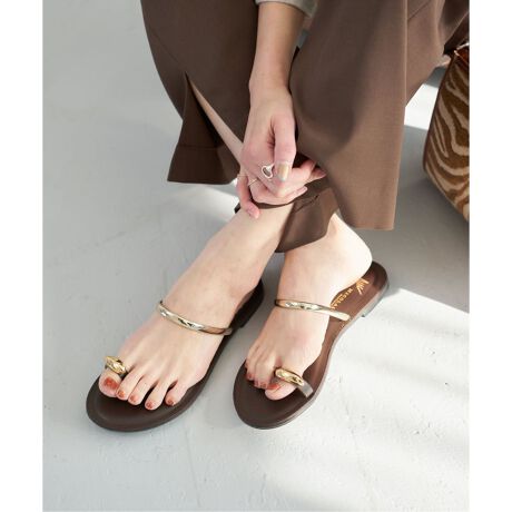 フラットなソールがリラクシーな雰囲気に、サムリングのメタルパーツが足元をより華やかでラグジュアリーな印象に見せてくれます。