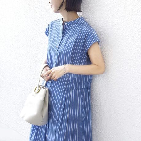 サイドに入れたタックがポイントのストライプシャツワンピース。