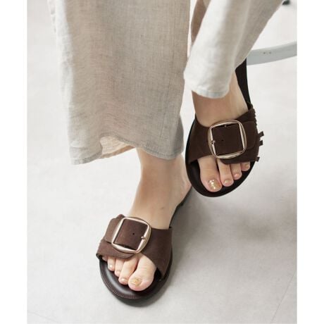 大きめのバックルとサイドのフリンジがアクセントになるNICOLAS LAINASのフラットサンダル。