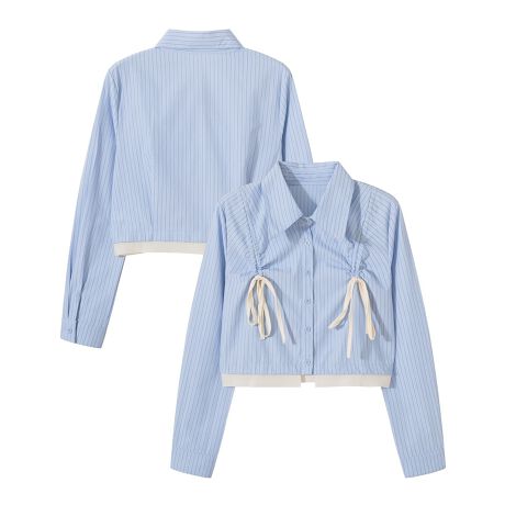 【HOOK】for girls 紐シャーリングレイヤード風長袖ストライプシャツ