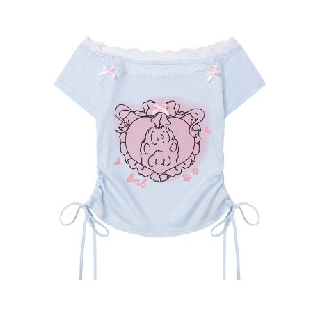 ネックラインに施された繊細なレースと、胸元の大きなプリントが視線を集めるデザイン。サイドのリボンでシルエットの調整も可能で、ギャザーを寄せることでスタイルアップ効果も抜群。肩部分のミニリボンもアクセントになっており、細部にまでこだわりが光ります。