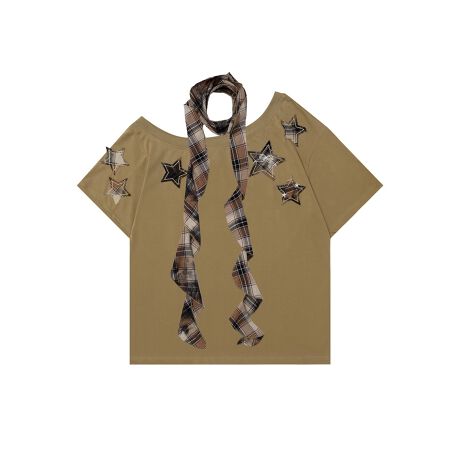 大胆な星型アップリケとチェック柄スカーフが印象的なデザインTシャツです。肩周りに散りばめられた立体的なスターがアクセントになり、コーディネートに個性をプラス。どこか遊び心のあるディテールが魅力的です。
