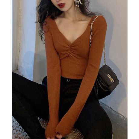 細見効果が抜群なキャザー入リブニットトップス。 深いVネックデザインで首元を華やかに魅せてドキッとさせてしまう。 単品使いはもちろん、ジャケットなどのアウターとレイヤードして使うのも良し。