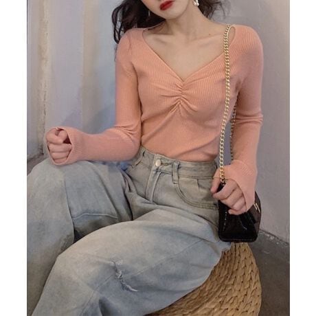 細見効果が抜群なキャザー入リブニットトップス。 深いVネックデザインで首元を華やかに魅せてドキッとさせてしまう。 単品使いはもちろん、ジャケットなどのアウターとレイヤードして使うのも良し。