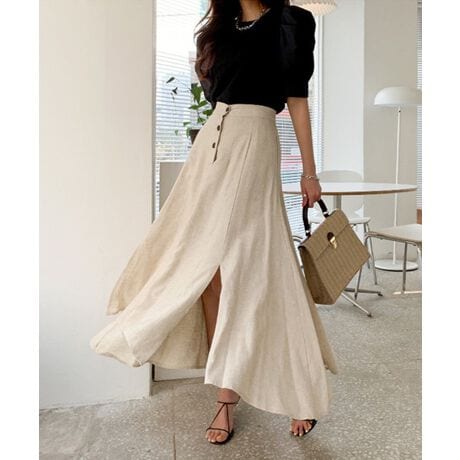 麻のナチュラルロングスカート。たっぷりあしらわれた麻の生地がエレガント 流行りのハイウエストマーメイドスカートでスタイル高みえです! 両サイドのスリットもセクシー。