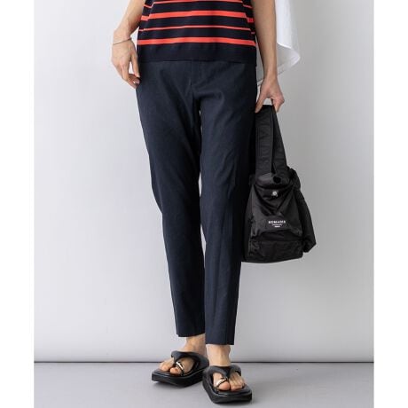 リネン混ならではの清涼感と、動きやすいストレッチ性を両立した、夏に欠かせないテーパードパンツです。フロントはファスナー開きとベルトループを施した本格的な仕様ですっきりとした印象を与えつつ、ウエストの後ろ部分はゴム仕様にすることで、締め付け感のない快適な穿き心地に仕上げました。ヒールを合わせても裾がもたつかない絶妙な丈感で、足元を軽やかに演出します。同素材のジャケットと合わせたセットアップスタイルなら、オフィスシーンにも最適。Tシャツやブラウスと合わせれば、大人のリラックスカジュアルも楽しめます。カラーは、着回しの効くオフ(#001)・ブラック(#005)・ネイビー(#075)のベーシックカラーに加え、ニュアンスのあるサンド(#033)・モカ(#030)・ダークブラウン(#035)、着こなしのアクセントになるキャロット(#020)・グレイッシュブルー(#070)の全8色展開です。