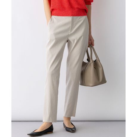 リネン混ならではの清涼感と、動きやすいストレッチ性を両立した、夏に欠かせないテーパードパンツです。フロントはファスナー開きとベルトループを施した本格的な仕様ですっきりとした印象を与えつつ、ウエストの後ろ部分はゴム仕様にすることで、締め付け感のない快適な穿き心地に仕上げました。ヒールを合わせても裾がもたつかない絶妙な丈感で、足元を軽やかに演出します。同素材のジャケットと合わせたセットアップスタイルなら、オフィスシーンにも最適。Tシャツやブラウスと合わせれば、大人のリラックスカジュアルも楽しめます。カラーは、着回しの効くオフ(#001)・ブラック(#005)・ネイビー(#075)のベーシックカラーに加え、ニュアンスのあるサンド(#033)・モカ(#030)・ダークブラウン(#035)、着こなしのアクセントになるキャロット(#020)・グレイッシュブルー(#070)の全8色展開です。