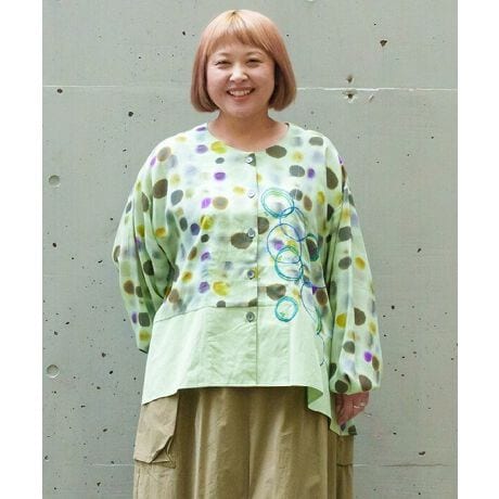 カラフルでモヤがかった水玉プリントが印象的で、コーディネートにさりげない華やかさをプラスします。
