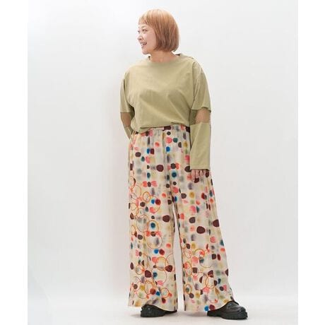 カラフルでモヤがかった水玉プリントがコーデの主役になる一枚です。
