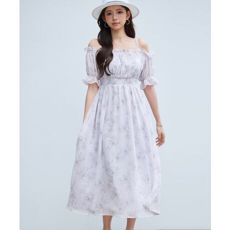 肩出しが開放感あるオフショルダーのデザイン。ふんわりロング丈も重くならず、可愛さもアピールできます。