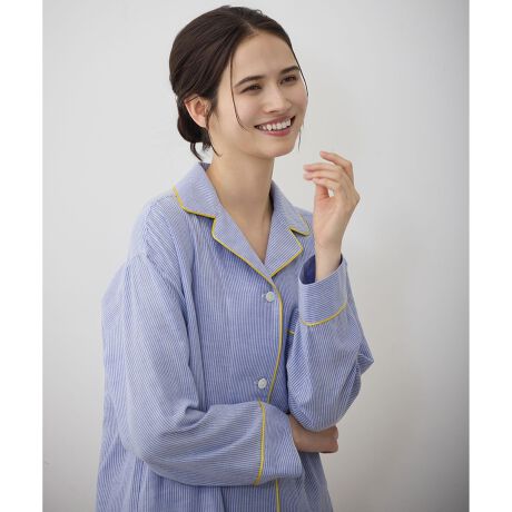 巾着付きで持ち運びにも最適!配色のパイピングがアクセントのオーガニックコットンパジャマ■デザインパイピングの配色とポケットの刺繍がポイントのパジャマです。ゆったりとしたオーバーサイズで、肩まわりも動かしやすく、締め付け感のないリラックスシルエットに仕上げました。パンツはウエスト総ゴム仕様で、内側の紐でサイズ調整が可能になっています。脇のシームをなくすことで、縫い代のあたりを気にせず、より快適な履き心地を実現しています。付属のサテン巾着は、旅行などの持ち運びや、ギフト用としてもおすすめめです。ブルーストライプ×イエロー(270)とグレーストライプ×グリーン(404)にはシルバーの巾着、レッドストライプ×ブラウン(310)とイエローストライプ×ブルー(540)にはゴールドの巾着が付きます。自分用にはお気に入りのカラーを選んで、おうち時間を心地よく過ごしてみてください。と【生地×パイピングの全4パターン】ブルーストライプ×イエロー(270)レッドストライプ×ブラウン(310)グレーストライプ×グリーン(404)イエローストライプ×ブルー(540)■素材先染めのオーガニックコットンを100%使用したダブルガーゼです。薄手でありながらふんわりと膨らみのあるソフトな風合いに仕上げました。表面はストライプ、裏面はシャンブレーで2つの表情を楽しめるデザインになっています。