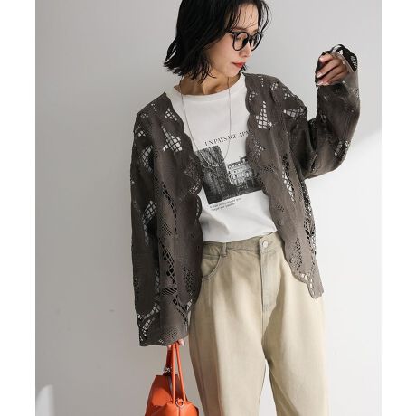 華やかなレースで軽やかに彩る、大人の抜け感。繊細なレースを贅沢にあしらったデザインが魅力のカーディガンです。スカラップ仕立てのレースが柔らかな印象を与え、上品で女性らしい雰囲気を演出してくれます。ほどよいハリ感のある素材は型崩れしにくく、美しいシルエットをキープしながら軽やかに着用できます。深すぎないVネックデザインは首元をすっきりと見せ、インナーとの組み合わせでさまざまな着こなしを楽しめるのもポイントです。カジュアルなデニムスタイルから、スカートやワンピースと合わせたきれいめコーデまで幅広く対応します。軽く羽織るだけでコーディネートが華やぎ、季節の変わり目にも重宝する便利なアイテムです。日常使いはもちろん、ちょっとしたお出かけや特別なシーンにも活躍し、上品なスタイルを自然に引き立ててくれます。透け感[あり]