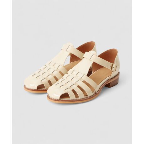 ARTESANOSとのダブルネームサンダル。ガラスレザーが汚れもつきにくく、且つ品の良い光沢感がカジュアルさを一掃して、フラットでも大人っぽくスタイリングを昇華してくれます。ソックスやタイツ合わせも出来るデザインで、シーズン長く履けるのも魅力。