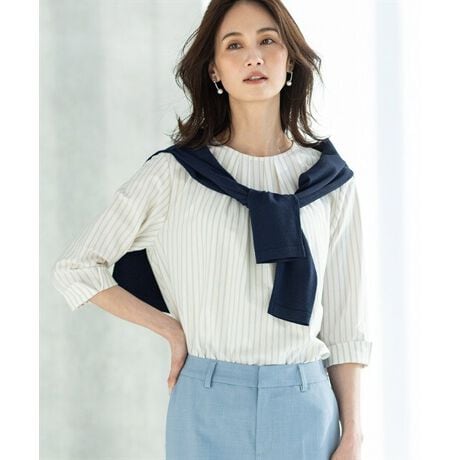 [型番:351685]縦ラインですっきり見せる、上品ストライプ繊細なストライプ柄にフロントタックを施し、きれいめな印象に仕上げたプルオーバー。ゆとりのあるシルエットで体のラインを拾いにくく、大人カジュアルにも取り入れやすい一枚です。テーパードパンツで通勤スタイルに、デニムで程よく抜け感を出す着こなしもおすすめ。