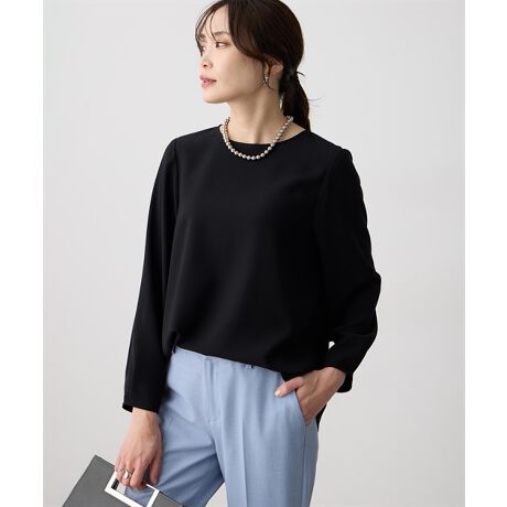 [型番:353847]きれい見えも、動きやすさもストレッチ性のあるジョーゼット素材を使用したブラウス。スリーブのさりげないタックが、上品な立体感を演出します。すっきりとしたシルエットで、オンオフ問わず活躍する一枚。テーパードパンツで通勤スタイルに、デニムで大人カジュアルにもおすすめです。