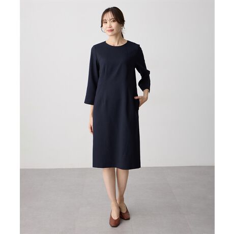 [型番:353848]涼やかに映える、上品シンプル麻のようなナチュラルな表情が魅力の合繊ワンピース。すとんと落ちるシルエットが体のラインを拾いにくく、上品な印象に。バックファスナー仕様で着脱もスムーズ。一枚でさらりと着こなすのはもちろん、ジャケットを羽織れば通勤やきれいめシーンにも活躍します。