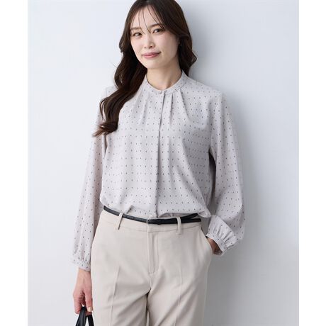 [型番:353849]上品な幾何柄で魅せる、洗練ブラウス小さな幾何柄を散りばめた、上品な印象のブラウス。控えめなスタンドカラーが顔まわりをすっきりと見せてくれます。デニムで抜け感を出したり、テーパードパンツやスカートと合わせてきちんと感のある着こなしもおすすめです。オンオフ問わず活躍する、着回し力の高い一枚です。