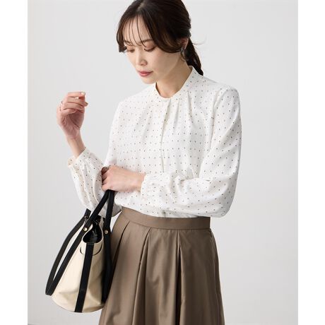 [型番:353849]上品な幾何柄で魅せる、洗練ブラウス小さな幾何柄を散りばめた、上品な印象のブラウス。控えめなスタンドカラーが顔まわりをすっきりと見せてくれます。デニムで抜け感を出したり、テーパードパンツやスカートと合わせてきちんと感のある着こなしもおすすめです。オンオフ問わず活躍する、着回し力の高い一枚です。