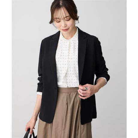 [型番:355621]しなやかに決まる、きれいめジャケットストレッチ性のあるジョーゼット素材を使用したテーラードジャケット。程よい落ち感があり、すっきりとしたシルエットを演出します。軽やかな着心地で、オンオフ問わず活躍する一枚。テーパードパンツと合わせて通勤スタイルに、デニムで大人カジュアルにもおすすめです。