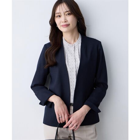 [型番:355623]軽やかにきちんと見え麻のようなナチュラルな風合いが魅力のカラーレスジャケット。すっきりとしたVラインが、顔まわりをシャープな印象に仕上げます。程よくコンパクトなシルエットで、きれいめにも大人カジュアルにも対応。テーパードパンツで通勤スタイルに、ワンピースに羽織って上品に着こなすのもおすすめです。