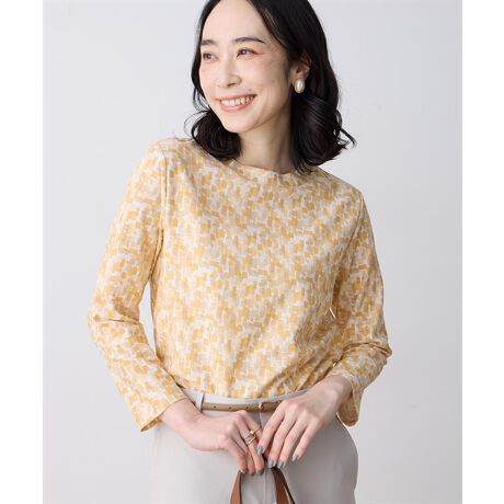 [型番:491252]彩りを重ねた、やわらかモザイク柄繊細な総柄プリントが目を引く、上品な表情のプルオーバー。主張しすぎない配色で、大人カジュアルにもきれいめスタイルにも自然に馴染む一枚です。センタープレスパンツで端正にまとめたり、カーディガンを羽織って軽やかなレイヤードもおすすめ。