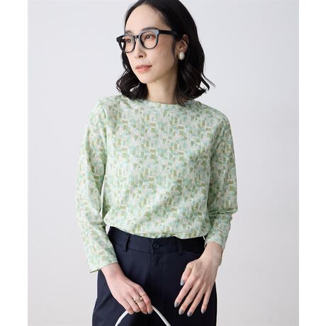 [型番:491252]彩りを重ねた、やわらかモザイク柄繊細な総柄プリントが目を引く、上品な表情のプルオーバー。主張しすぎない配色で、大人カジュアルにもきれいめスタイルにも自然に馴染む一枚です。センタープレスパンツで端正にまとめたり、カーディガンを羽織って軽やかなレイヤードもおすすめ。