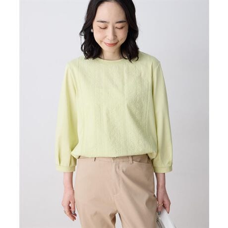 フロントに施した刺しゅうレースが、さりげなく華やかな印象を与える一枚。