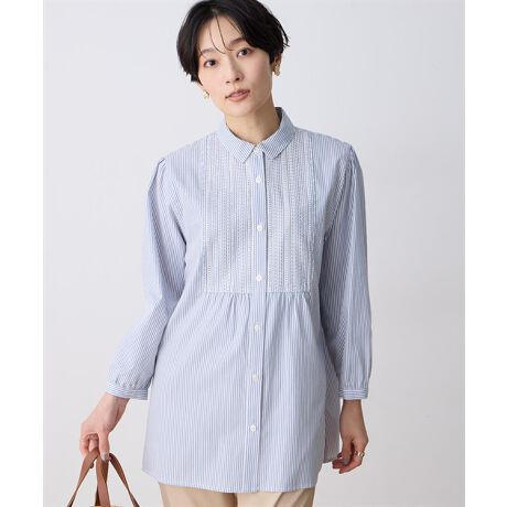 [型番:493079]爽やかに映えるストライプブラウス繊細な刺しゅうを重ねたストライプ柄が上品な印象を与えるブラウス。切り替え下のギャザーがやさしく広がり体のラインを拾いにくく、大人カジュアルに取り入れやすい1枚です。ワイドパンツでリラックス感を出したり、ロングベストを重ねたレイヤードコーデも楽しめます。
