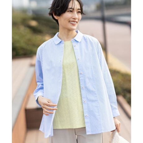 [型番:493085]情を楽しむパッチワークブラウス異なる柄や素材感を組み合わせたデザインがさりげなく映える一枚。ゆとりのあるシルエットで体のラインを拾いにくく大人カジュアルにもきれいめにも取り入れやすい仕上がりです。テーパードパンツで端正にまとめたりデニムを穿いて抜け感を出したりスカート合わせでやわらかな印象にも楽しめます。