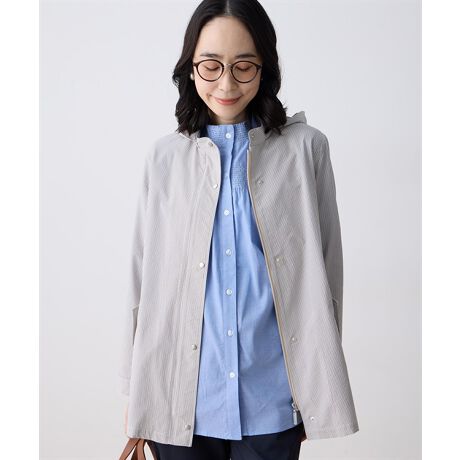 [型番:495643]軽やかに羽織れるサッカーストライプジャケット起伏のあるサッカー素材が肌離れよく爽やかな印象を与えるジャケット。フード付きデザインでカジュアルにもきれいめにも取り入れやすくロングシーズン活躍します。ロゴTとデニムで軽快にまとめたり、ブラウスとテーパードパンツで上品に仕上げる着こなしもおすすめです。