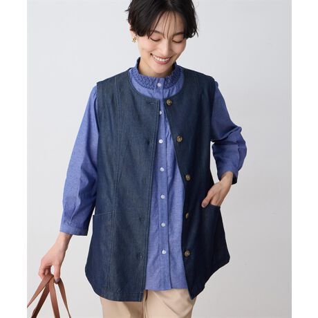[型番:495646]重ねるだけで旬顔デニムベストほどよく色落ちしたデニム素材がコーデに奥行きを与えるベスト。すっきりとしたシルエットで重ね着しやすく大人カジュアルにもきれいめにも取り入れやすいデザインです。ブラウスに重ねて上品に、ワンピースにプラスして縦ラインを強調する着こなしもおすすめです。