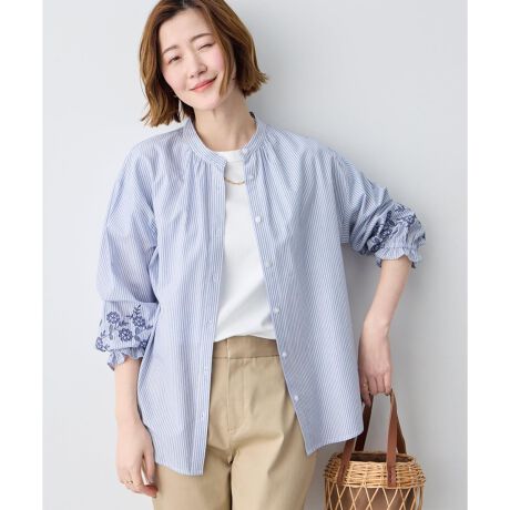 [型番:523294]スリーブにさりげない華やぎを添えた一枚袖にあしらった刺しゅうが、上品なアクセントになる前開きブラウス。すっきりとした衿元デザインで、きれいめな印象に。前開き仕様で着脱しやすく、羽織りとしても活躍します。テーパードパンツでクリーンに、スカートと合わせて女性らしい着こなしもおすすめです。