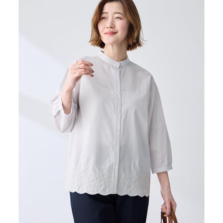 [型番:523295]さりげない甘さで、きれいめに繊細な表情のある素材が上品な印象を与えるブラウス。裾のスカラップデザインが、コーディネートにやわらかなアクセントを添えます。すっきりとしたシルエットで、きれいめにもカジュアルにも取り入れやすい一枚。カーディガンを羽織って季節の変わり目にも活躍します。