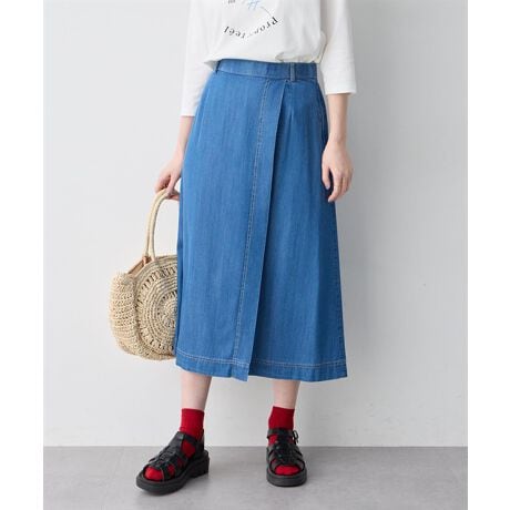 [型番:524323]軽やかに揺れて、デニムを上品にタックデザインが立体感を生み出す、上品な印象のデニムスカート。程よいフレアシルエットで、動くたびに軽やかな表情を演出します。ウエストまわりはすっきりと見せつつ、穿きやすさにも配慮。同系色トップスと合わせたワントーンコーデもおすすめです。