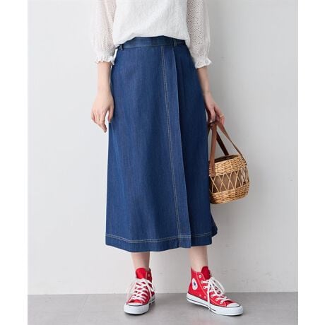 [型番:524323]軽やかに揺れて、デニムを上品にタックデザインが立体感を生み出す、上品な印象のデニムスカート。程よいフレアシルエットで、動くたびに軽やかな表情を演出します。ウエストまわりはすっきりと見せつつ、穿きやすさにも配慮。同系色トップスと合わせたワントーンコーデもおすすめです。